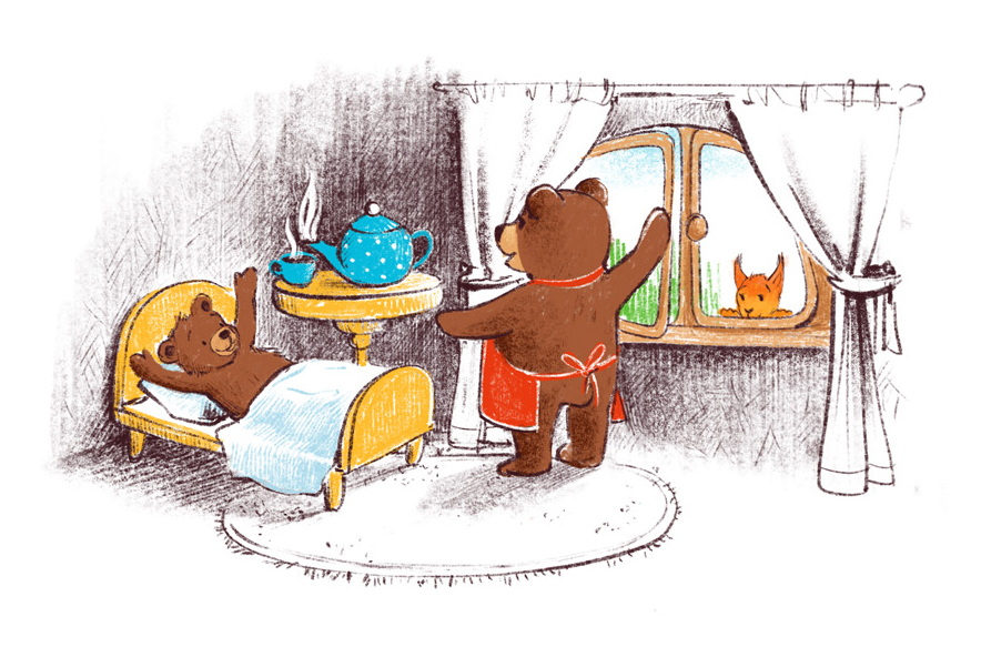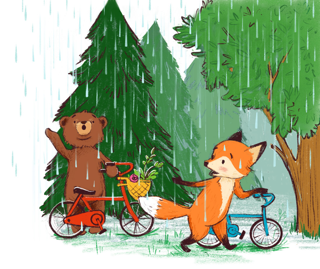 Однажды медвежонок Тим пригласил в гости своего друга лисёнка. Они хотели покататься на велосипедах в лесу. Когда зверята вышли на улицу, начался дождик, а им совсем не хотелось намочить свои шубки.