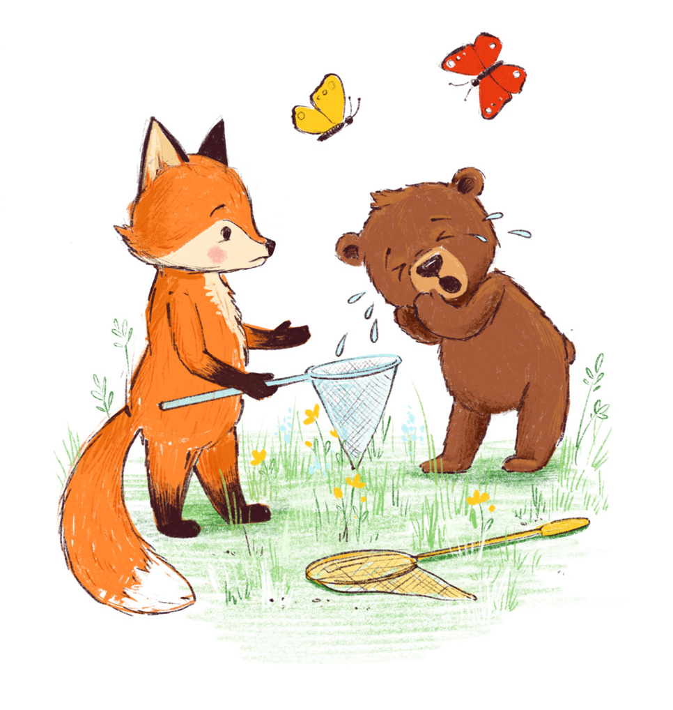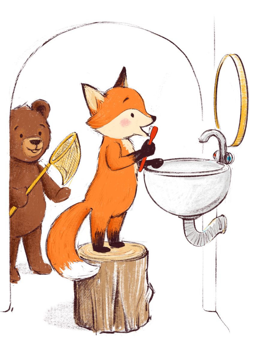 По дороге он встретил своего друга лисенка и позвал его с собой играть. Лисенок в это время чистил зубки и причесывал свою шерстку.