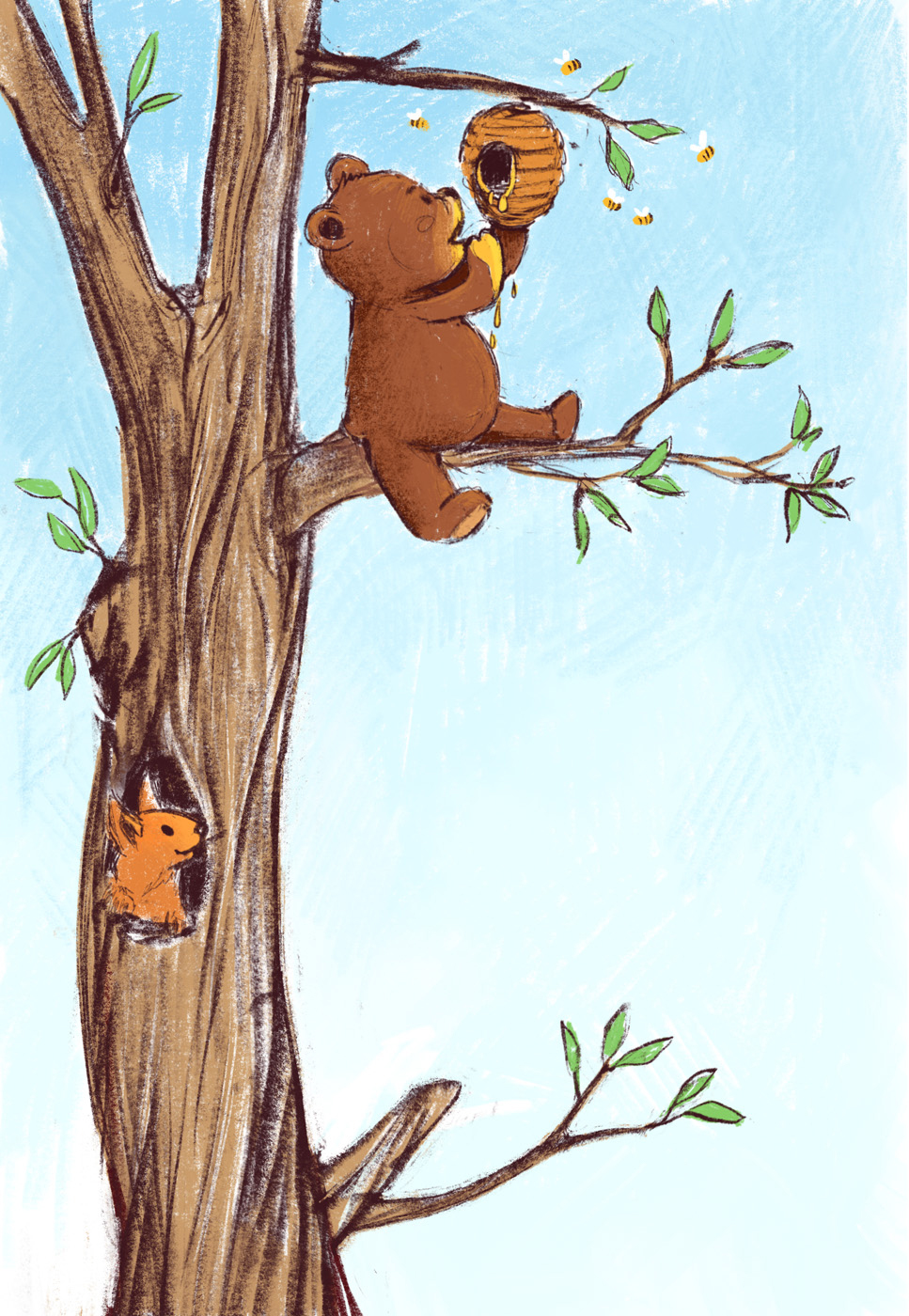 Медвежонок не стал ждать лисенка и помчался дальше. Тут на пути ему попалось дерево, на котором висел улей. Тим решил полакомиться мёдом, он забрался на самую верхушку дерева и просунул лапу в улей. Мёда было так много, медвежонок никак не мог остановиться, он хотел съесть всё. Но вдруг у него заболел зуб. Тим слез с дерева и горько заплакал, ему уже было не до мёда, и уж тем более не до бабочек.