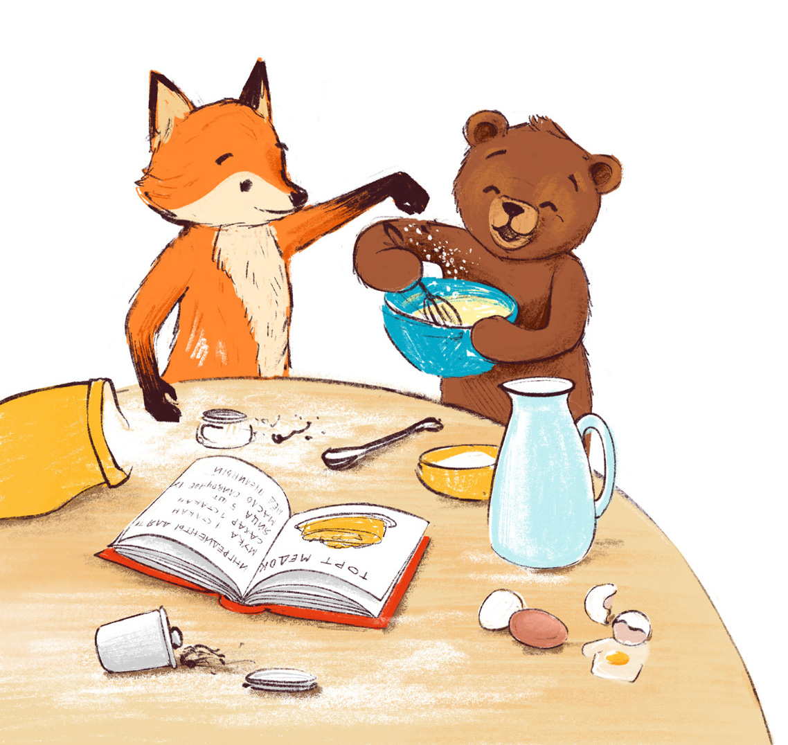 Медвежонок предложил испечь торт. Малыши взяли мамину книгу с кулинарными рецептами и принялись готовить. Зверята очень старались, но ничего не вышло. В книге были какие-то непонятные буквы, а читать малыши ещё не научились. Зато получился такой беспорядок на кухне!