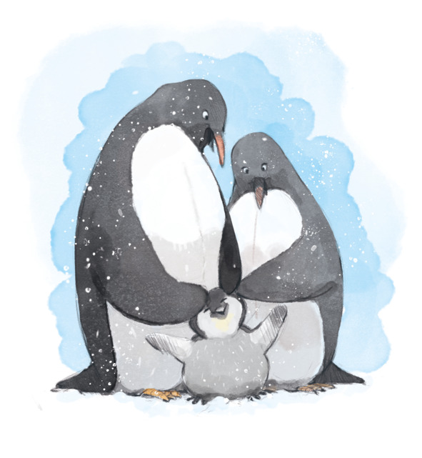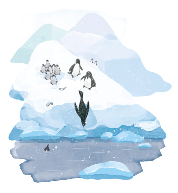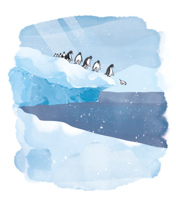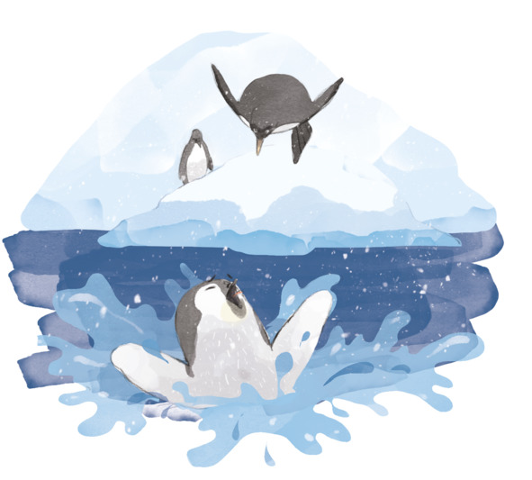 Пингвинёнок стал у края скалы, посмотрел вниз, расправил крылышки и прыгнул. Только крылья его не приспособлены для полёта – Клим очень испугался, когда нырнул в море. Хорошо, что папа в это время неподалёку ловил рыбу и увидел, как маленький пингвинёнок попал в беду. Они вскарабкались на камни, и папа прижал к себе напуганного малыша. Отдышавшись, они направились к скале.