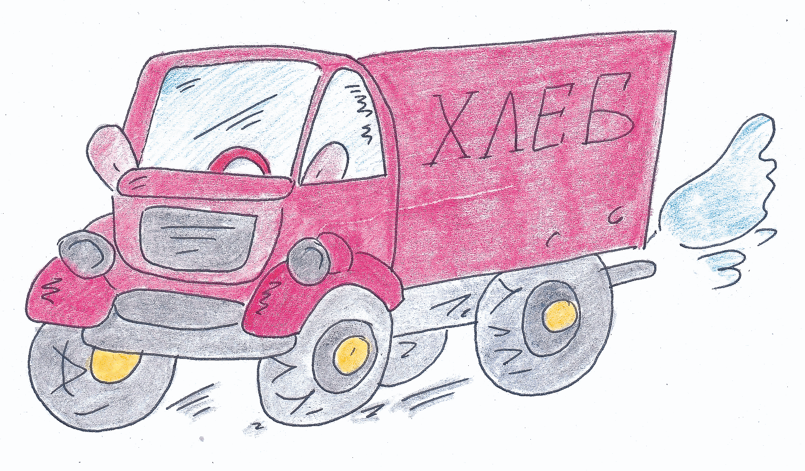 Матвейка обошёл вокруг машины три раза, внимательно изучая все детали. У грузовика были старые колеса и где-то облупилась краска на кабине. А на фургоне была какая-то надпись большими буквами, тоже потертая. Матвейка уже выучил весь алфавит и немного умел читать. Почесав затылок, он стал медленно читать надпись: «Хлеб».