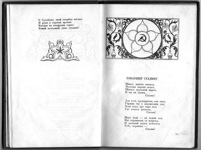 Светочу мира, любимому Сталину…Рабочих всех объединив,Царя-злодея низложив,Ушёл он[2], дело поручивТебе, великий Сталин!…Железным ломом горы злаТобой разрушены дотла,Заря над родиной взошла,Мудрейший вождь наш – Сталин!…Ты днём и ночью у руля,Тебе послушна вся земля.Правь, Сулейман, так говоря:Создатель счастья – Сталин!…Живое двигая вперёд,Могучих партия ведёт,Шагает трудовой народ,И ты их знамя, Сталин!Привет вождю, привет солнцу…Друзья, нам Сталин жизнь открыл,Сердца нам правдой озарил,Страну могуче возродилИ сделал в мире самой лучшей.