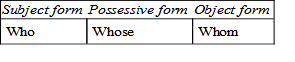 In these three sentences we have the pronoun who used in its three forms, subject, possessive and object form. We should be very careful not to confuse the subject and the object forms of the pronoun who.