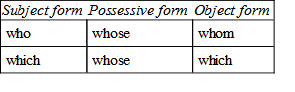 That and what have the same form for both the subject and object forms. They have no possessive form. Who has a different form for the subject form and the possessive form and the object form. Which has the same form for subject and object forms, and a different form for the possessive form. Note the following: