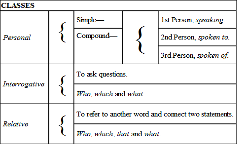 232. There is one other class of pronouns which plays a great part in our speech and is a wonderful help to us. For example, suppose I want to tell you several things about this book. I say: I am reading this book. It interests me greatly. Now it would be a great advantage to me if I could put these two sentences together, and we have for this use a pronoun which makes it possible for us to combine these sentences, and so I say:
