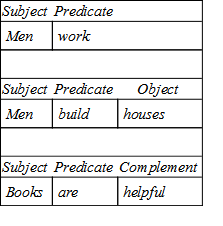 This is not the order in which the elements will appear in the sentence, but this is the order of their importance. We first look for the simple subject and the simple predicate; then we can determine which words are the modifiers of the subject; then we find the object or predicate complement of the verb and the modifiers of the verb; and thus we have all of the elements which go into the construction of the simple sentence.