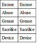 The spelling lessons for Monday, Tuesday and Wednesday contain words ending in cognate sounds, in which the words ending with a soft sound are nouns and the words ending in the hard sounds are verbs. Add others to this list as they occur to you.