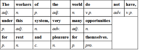 We have studied all the parts of speech, and now our work is to combine these parts for the expression of thought. It will be good practice and very helpful to us to mark these different parts of speech in our reading. This helps us to grow familiar with their use. It also helps us to add words to our vocabulary and to learn how to use them correctly. In the following quotation, mark underneath each word, the name of every part of speech. Use n. for noun, v. for verb, pro. for pronoun, adv. for adverb, adj. for adjective, p. for preposition and c. for conjunction. Write v. p. under the verb phrases. For example: