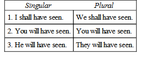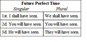 128. The future perfect time form expresses or describes an action that will be perfected or completed before some other future time. It is formed by using shall have or will have with the past participle.