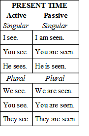 Note that the only change in the verb form in the present ACTIVE is the s-form for the third person singular. In the present passive the only change is the special form of the verb be for the first and third persons, singular.