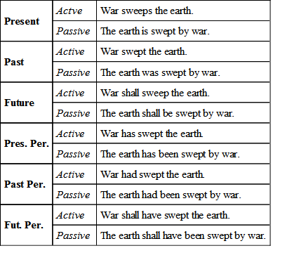 Write the four following sentences in their active and passive forms, as the sentence, War sweeps the earth, is written.