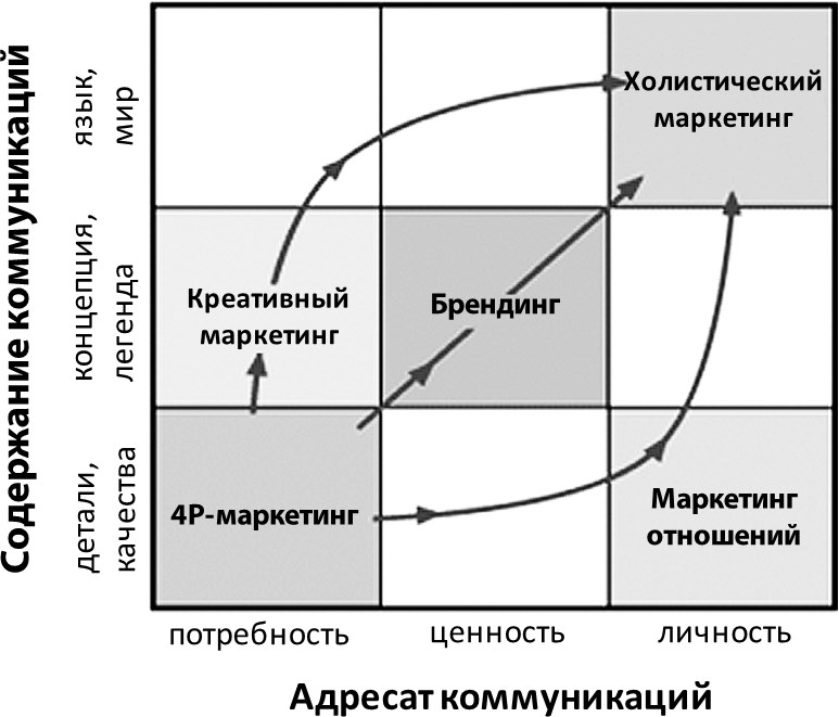 Холистический подход к современной концепции маркетинга коррелирует и с новым понятием «маркетинг 3.0», предложенным Ф. Котлером, согласно которому маркетинговая деятельность компаний должна учитывать «биологическую природу потребителей, состоящую из четырех компонентов: физическое тело, разум, сердце и дух» [144, р. 34]. Иными словами, Ф. Котлер утверждает необходимость работы компаний в рамках своей маркетинговой деятельности с эмоциями, страхами и желаниями своих клиентов.