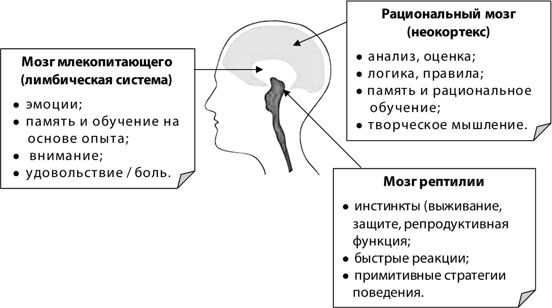 Каждая из этих частей играет особую роль: неокортекс (рациональный мозг) думает, лимбическая система (эмоциональный мозг) чувствует, рептильный мозг принимает решения. Работа с потребительским поведением в контексте нейромаркетинга предполагает изучение всех трех блоков [167].