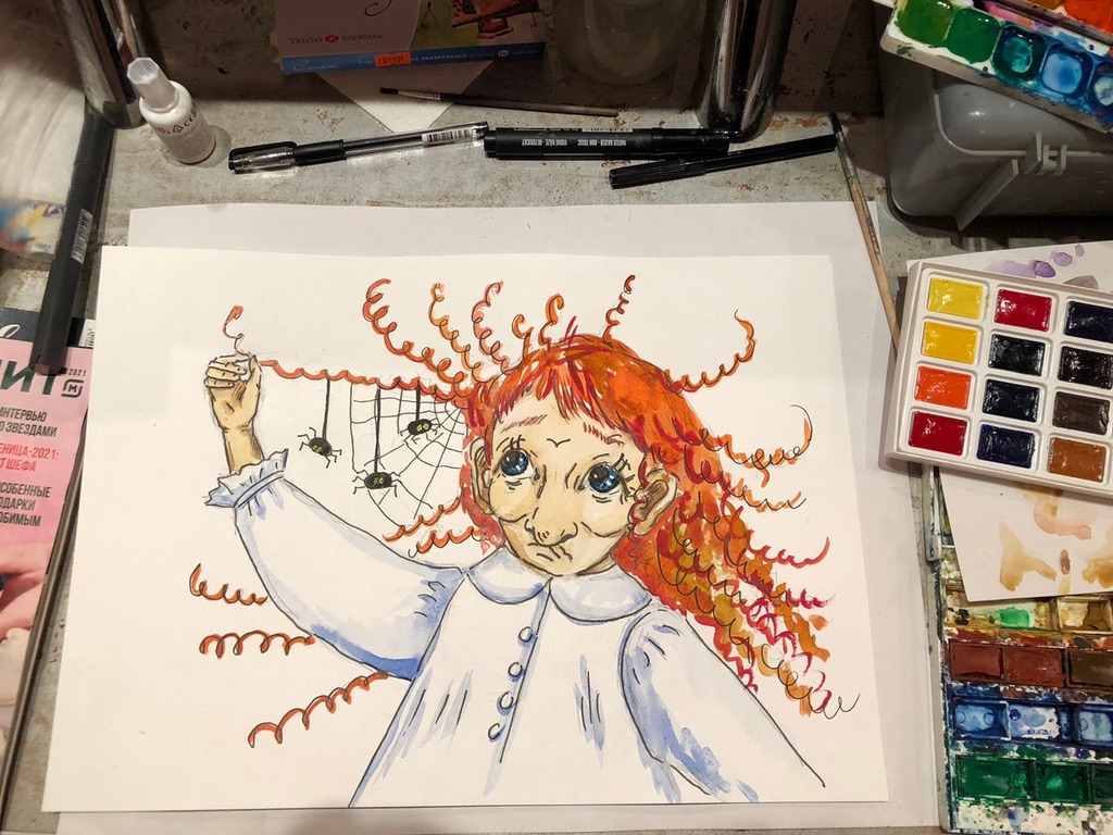 Направившись на свою любимую маленькую кухоньку, она мимоходом бросила взгляд на своё отражение в зеркале и вскрикнула, подпрыгнув от неожиданности! На ее обычно аккуратно всклокоченной голове царил вопиющий хаос: длинные волосы были завязаны в многочисленные узелки, пряди торчали в разные стороны, на некоторых красовались легкие витиеватые паутинки! Невероятным было то, что в центре всего этого безобразия кипела бурная деятельность – заплетая все эти узелки и паутинки, в волосах Старушки Коклюшки, пыхтя, трудились веселые паучки. Их было трое. И эти затейники были хорошо знакомы Старушке Коклюшке, жили они в уголке на ее балконе и обычно свои творческие фантазии воплощали на ветках деревьев, пушистых кустиках, камышах, но чтобы в пышной шевелюре нашей героини – это уж слишком! Паучков звали Тыся, Пышун и Кука, они были так увлечены, что не заметили, как Старушка Коклюшка буквально испепеляла их возмущенным взором. Демонстративно кашлянув, Старушка яростно помотала головой и попыталась стряхнуть чудиков, что, признаться, не возымело практически никакого эффекта.