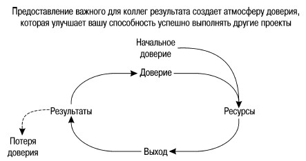 Предоставление важного для коллег результата создает атмосферу доверия, которая улучшает вашу способность успешно выполнять другие проекты ресурсы и разрешение проводить различные ИТ-инициативы. Результаты воплощения этих инициатив зависят от того, какую пользу они приносят компании с точки зрения руководства компании – уменьшают или увеличивают доверие к CIO. Весь процесс представляет собой некую виртуозную последовательность или нисходящую спираль. Каждый успех – с точки зрения лидеров – повышает доверие к CIO, а неуспех или провал – снижает это доверие.