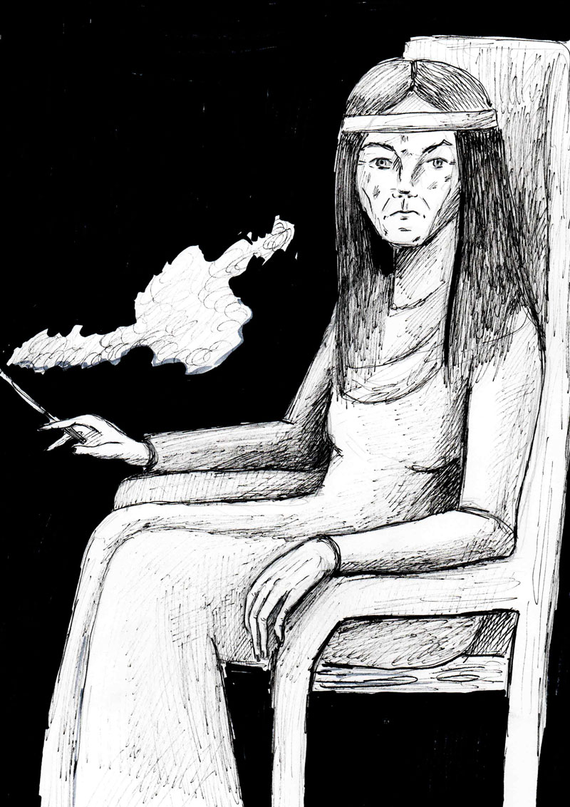 Эмма поджала губы и, ломая руки, приблизилась к креслу. В нём сидела высокая, худая женщина, на вид лет сорока – пятидесяти, и курила сигарету, держа длинными тонкими пальцами мундштук. Несмотря на её роскошное, окаймлённое золотой бахромой тёмно-фиолетовое платье с поясом, усыпанным драгоценными камнями, хозяйка ветров производила неприятное, отталкивающе впечатление.