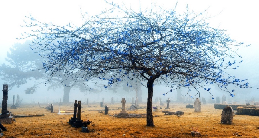 Representa armonía y fidelidad al recuerdo de la persona fallecida, color que tiene similitud con el cielo, que es el lugar en donde muchas creencias y religiones creen se dirigen las personas que mueren.