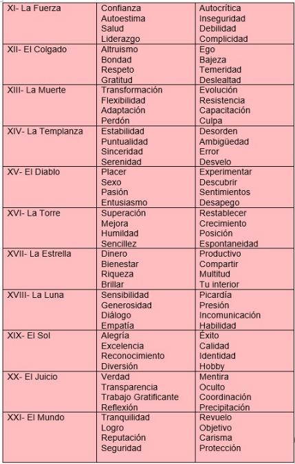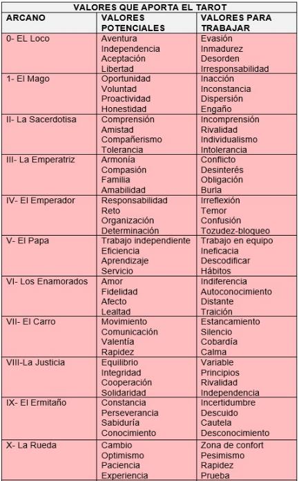 Como hemos podido ver, a lo largo del proceso de Coaching, se presentan una serie de valores que cada arcano del Tarot nos muestra, bien sean valores potenciales o valores para trabajar.