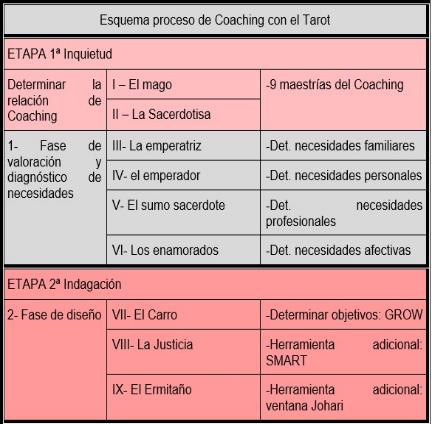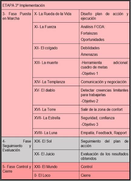 A continuación, expongo un esquema de lo que aporta cada carta del Tarot en este proceso de Coaching.