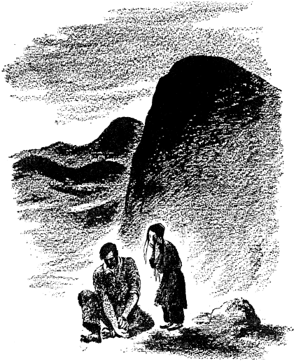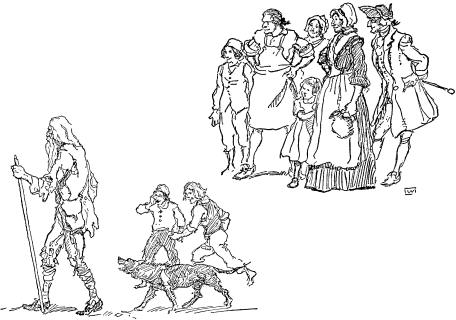 У него была собака по имени Волк. И вот однажды, чтобы избавиться от работы на ферме, Рип взял ружье и отправился вместе с Волком бродить по лесам. Забрался далеко. И вдруг слышит окрик: «Рип ван Винкль! Рип ван Винкль!» А его Волк тут же «ощетинился, зарычал, прижался к хозяину и замер…» И вот Рип видит странного незнакомца «с густою гривою волос и седой бородой. Одет он был по старинной голландской моде: в суконный камзол, перетянутый у пояса ремнем, и несколько пар штанов, причем верхние, необыкновенно широкие, были украшены сбоку и рядами пуговиц, а у колен – бантами. Он тащил на плече изрядный бочонок, очевидно наполненный водкой, и подавал Рипу знаки, прося его приблизиться и помочь».