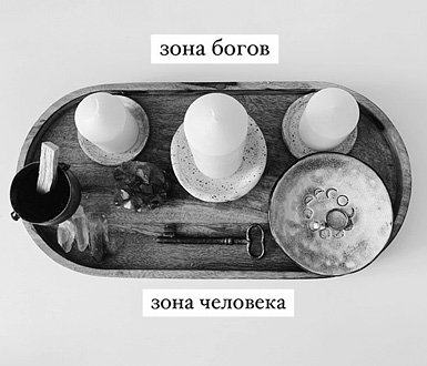 Теперь про размер зонЗоны могут варьироваться по размеру. Мы можем разделить алтарь на две равные половины, можем отвести бо́льшую часть зоне богов и наоборот. То есть эту черту мы очерчиваем сами на своем пространстве. Нет, вас не постигнет небесная кара за то, что вы или выши близкие нечаянно вторглись в зону богов, кинув туда ключи или положив второпях телефон. Тут действует принцип намерения. Я очерчиваю зону и условно считаю ее зоной богов, фиксируя это у себя в голове, а также в пространстве своего дома как данность. Потому что именно я хранитель и основатель этого конкретного алтаря. Это не значит, что стена за моим алтарем будет принадлежать богам, я очерчиваю только стол. Но если я захочу присоединить к алтарю, например, полку, то я фиксирую эту границу мысленно и считаю полку продолжением моего алтаря в пространстве уже в дальнейшей практике.