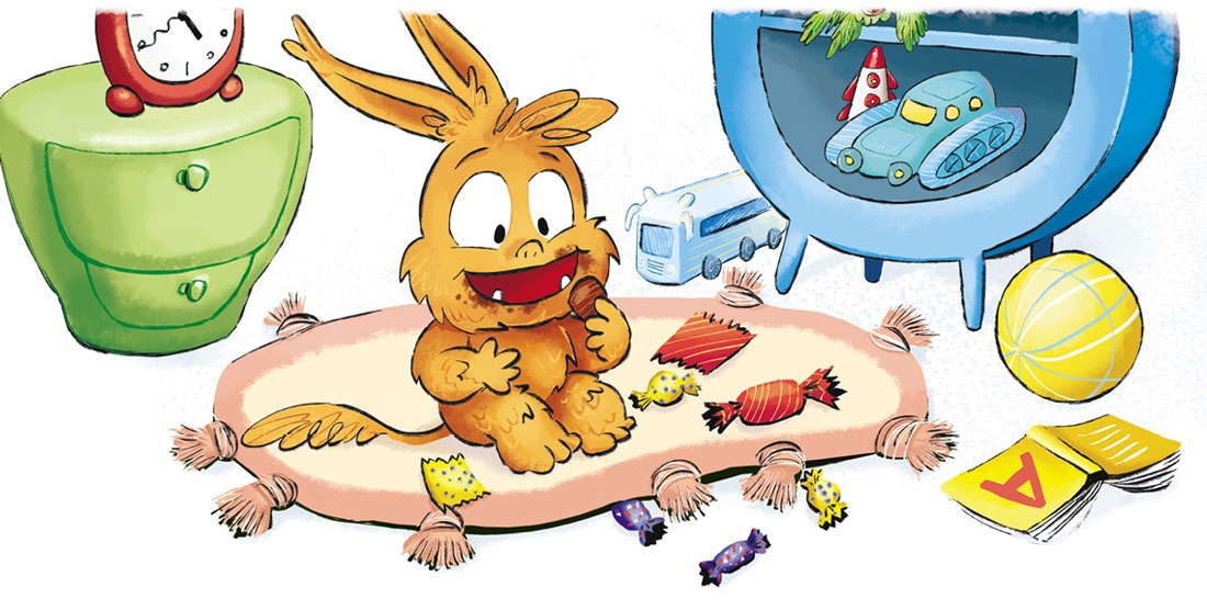 Вернувшись, мама всегда видела одну и ту же картину: Монстрик лежал на ковре и стонал, а вокруг него, словно пёстрые осенние листья, предательски шуршали фантики из-под конфет. Мама сажала малыша на лечебную диету: отварное мясо, рис и ничего сладкого! Его животик быстро проходил, но вот душа начинала болеть.