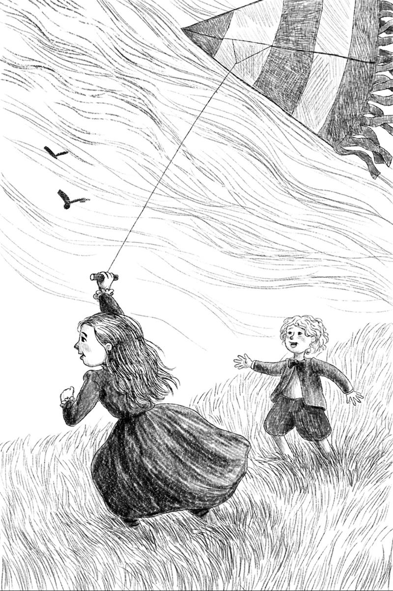 За собой змея тащила девочка. Стараясь разогнаться как можно быстрее, она смеялась и представляла, как взлетит вместе с ним. С радостными криками бежали ещё несколько ребят, они пытались перегнать девочку и змея.