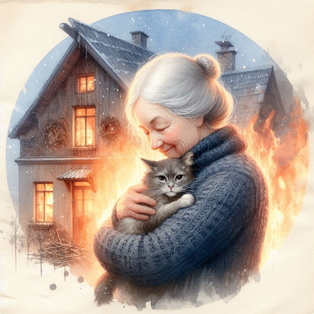 Тогда бабушка взяла единственное, что смогла: она завернула Мурзика в своё одеяло и крепко прижала его к себе. Вместе они вышли из горящего дома и укрылись под большим дубом, что рос недалеко. Сидя под деревом, бабушка тихо плакала, обнимая Мурзика и молясь о том, чтобы всё хорошо закончилось.