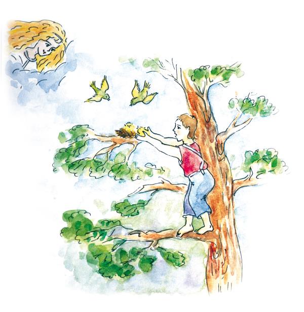 А где же Ангел? Алёша направился к своему дому. Подойдя к калитке, он увидел двух маленьких птичек, которые вились и щебетали у корней большого дерева. Подойдя поближе, Алёша увидел совсем маленького птенца, выпавшего из гнезда. Птицы-родители с тревожным щебетом метались над своим птенцом, не зная, как ему помочь. Алёша посмотрел вверх и подумал: «Какое высокое дерево. Пожалуй, эта задача будет потруднее, чем вытащить из воды жука и отнести домой соседского котенка». Перекрестился Алёша, посадил птенца за пазуху и со словами: «Господи, благослови!» – осторожно полез вверх. Лезть было трудно, птенец за пазухой изредка бился и пощипывал Алешу своим клювом. «Подожди, не мешай», – шептал мальчик, осторожно переставляя ноги. Ну, вот и гнездо. Еще миг, и птенец сидит на своем месте, а счастливые родители с радостным щебетом кружат вокруг гнезда.