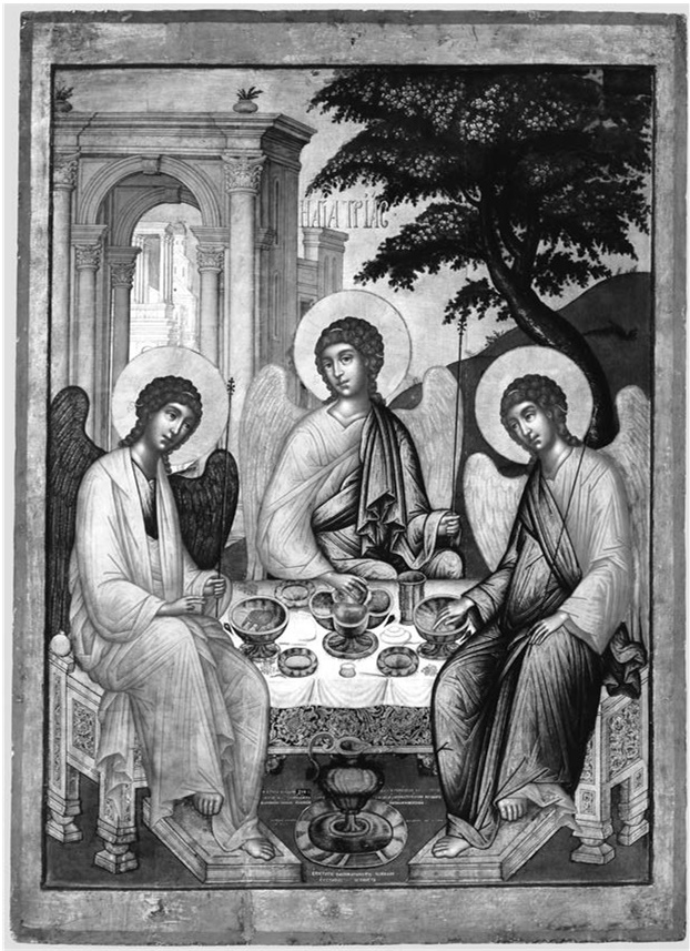Рис. 1. Андрей Рублев. Троица ветхозаветная. 1425–1427. Дерево, темпера. 141,5 × 114 см. Происходит из Троицкого собора Троице-Сергиева монастыря в Сергиевом Посаде. Хранится в Государственной Третьяковской галерее (Москва)