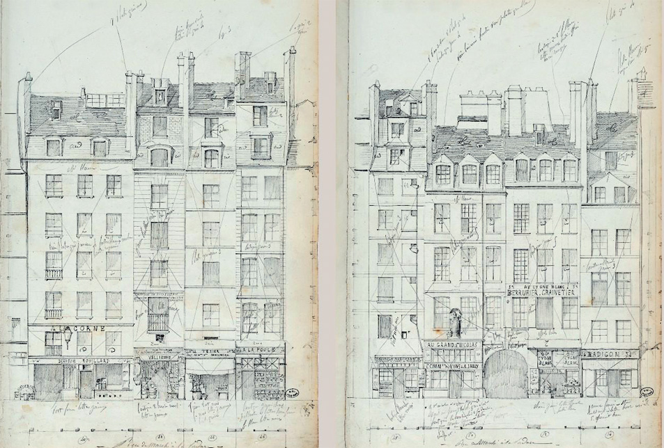Если мы говорим о деятельности Османа, то не он спроектировал главные парижские проспекты. Осман руководил операцией и заботился об административных аспектах, таких как общественные работы или финансирование. Именно урбанисту и архитектору Эжену Дешаму, куратору парижского плана, мы обязаны планировкой бульваров и авеню. В ноябре 1851 года Дешам, явно неравнодушный к историческому наследию, написал письмо архитектору Габриэлю Давиу: «Прорыв улицы Риволи уничтожит почти 250 домов, 80 из которых будут снесены в январе следующего года. Администрация хочет сохранить хотя бы память об этих районах, которые исчезнут». С помощью своей команды Давиу посвящает себя выполнению задачи по сохранению памяти, хотя она превышала первоначальный заказ и требовала много времени. Обмеры и перенос средневековых домов на бумагу продлились три года и затронули более чем 1000 домов, расположенных на нынешнем месте улицы Риволи между молельней и ратушей и на улице Сен-Жак на левом берегу. Дома были разрушены между 1852 и 1854 годами.