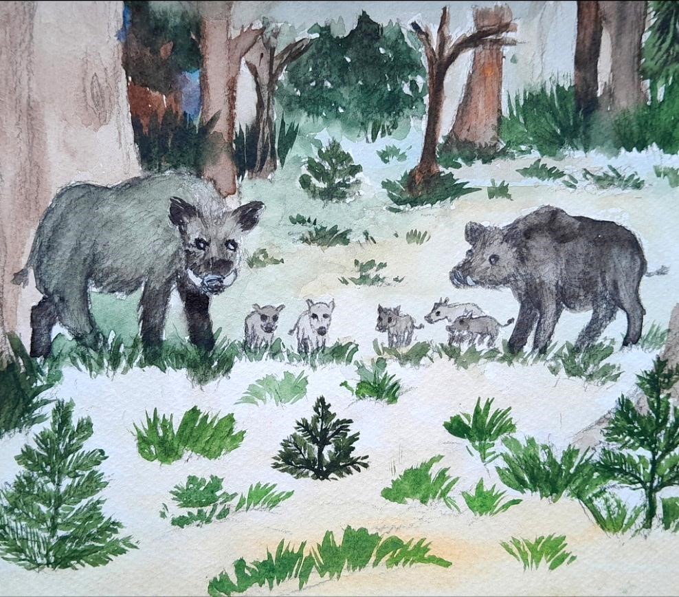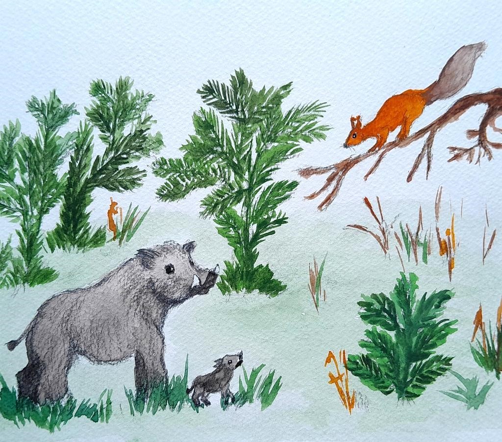 Кабанчик повернулся в сторону родителей. Они продолжали искать жѐлуди и корешки растений. Ему так хотелось быть на них похожим. Затем он кинулся к кусту с ягодами, но они росли так высоко, что он не мог достать до них. Он попытался подпрыгнуть, чем только рассмешил сороку.