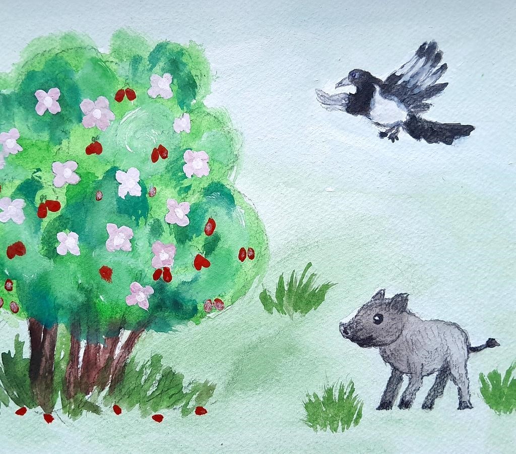 Пойдѐм, покажу, – сорока повела кабанчика в сторону ближе к кустарнику с плодами шиповника.