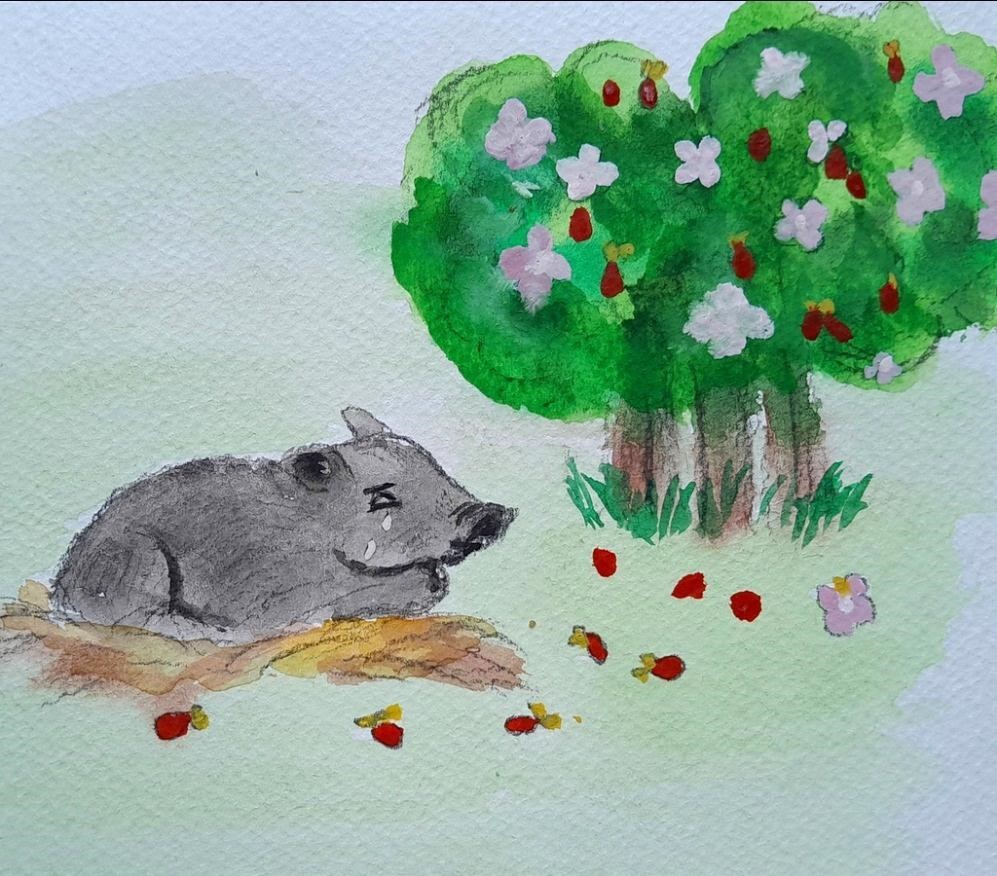 Радостно хрюкнув, Журжик начал есть одну ягоду за другой, довольно чавкая. Он ел, пока не наелся досыта. Внезапно у него разболелся животик. Кабанчик лѐг на землю и заплакал. Он стал звать сороку на помощь, но еѐ уже и след простыл.