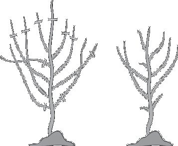 Для формирования кроны ветви обрезают на почку. При обрезке на почку правильный срез делается под углом примерно 45 градусов. Срез должен находиться буквально на 4–5 мм выше почки, но отступать слишком высоко тоже не следует (см. рис. «Правильная обрезка на кольцо и на почку»).