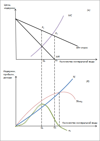 В ситуации, когда издержки равны нулю, данная фирма будет продавать количество товара Qn по цене Pn. С положительными издержками, будет продано количество товара Qc по цене Pc, в соответствии с маргинальным принципом. Отметьте, что, при количестве товара Qc, функция прибыли π1 находится в своём максимуме.