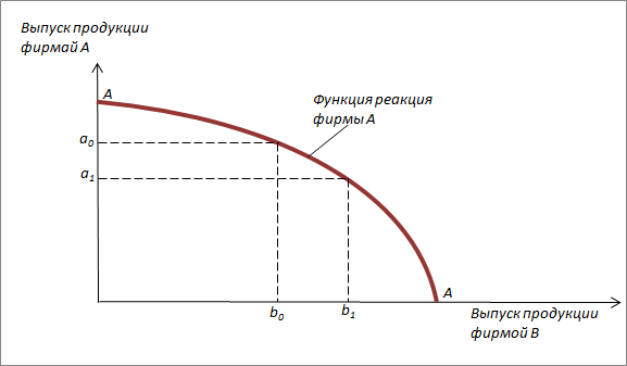 Кривая реакции продавца А описывает максимизирующий прибыль уровень выпуска готовой продукции для А, если задан каждый уровень выпуска готовой продукции продавцом В. Таким образом, если В решает производить количество продукции b0, А максимизирует свои прибыли, выпуская а0