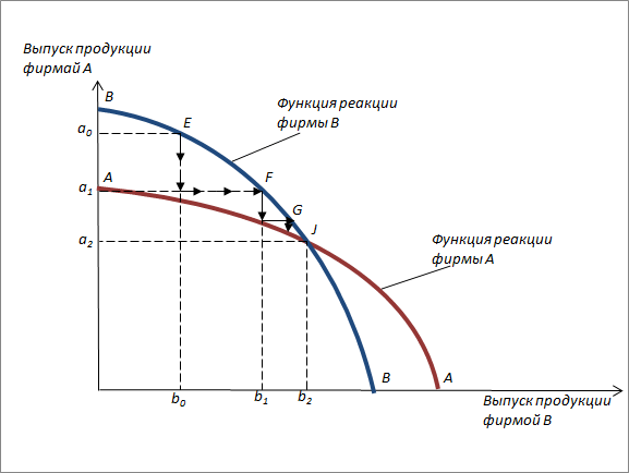 Начиная от точки J (когда объём выпускаемой В продукции равен b0), стрелки прочерчивают путь к стабильному рыночному равновесию (точка Е) через последовательные определения объёмов выпускаемой продукции на основе сопоставлений.
