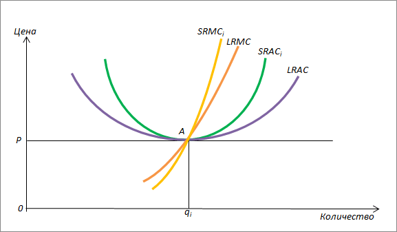 Долгосрочное рыночное равновесие для данной фирмы находится там, где самая низкая точка кривой LRAC и отдельная кривая SRAC являются касательными к рыночной цене.