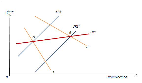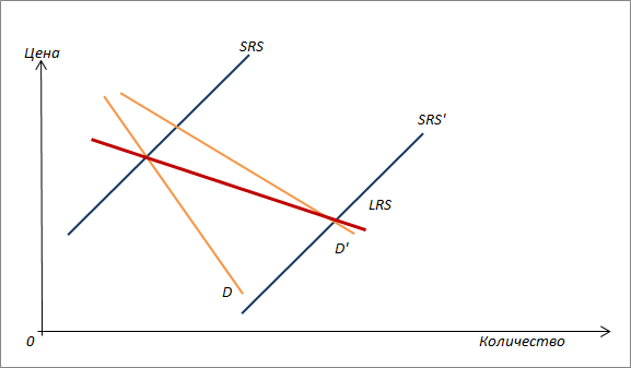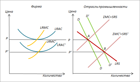 Краткосрочное увеличение рыночного спроса, от DD до D'D', обусловливает увеличение выпуска продукции существующими фирмами и привлекает в промышленность новые фирмы. Наличие внешних экономий понижает LRAC и LRMC каждой фирмы, и в результате получается долгосрочная понижающаяся кривая предложения (LRS