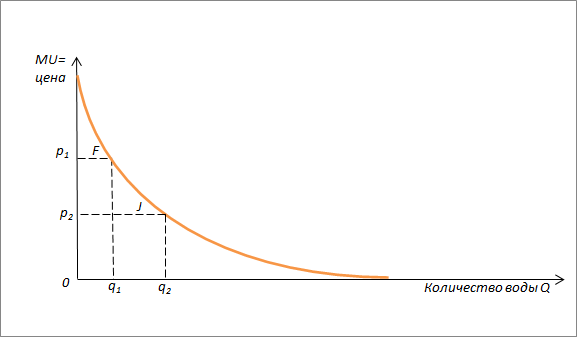 По мере того, как цена воды падает с р1 до р2, потребитель будет удовлетворять менее насущные потребности. По этой причине, потребление воды увеличится с q1 до q2