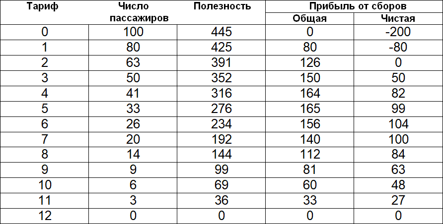 Данные Табл. 12–1 имеют отношение к тарифу или плате за проезд, которую может установить монопольная железнодорожная компания. Здесь Дюпюи рассматривал случай не ограниченного ничем в своих действиях монополиста, свободного установить некий тариф, максимизирующий его прибыли. Его монополист был нацелен на максимизацию прибыли, так как «если дорога или мост, или канал является частной собственностью, компания-владелец имеет только одну цель, и она состоит в том, чтобы получить наибольшую возможную прибыль благодаря тарифу. Итак, монополист имеет дело с графиком спроса Табл. 12–1, у которого отсутствуют затраты на производство, назначит тариф, равный 5 франкам, чтобы максимизировать прибыли или валовой доход. Этот пример был, затем, распространён на монополиста, у которого есть издержки производства, когда Дюпюи предположил, что «стоимость тяги» могла бы равняться 2 франкам за одну единицу проезда. Эти затраты на тягу можно идентифицировать как переменные издержки, и в этом случае, как правильно указал Дюпюи, тариф, максимизирующий чистую прибыль не тот же самый, что максимизирует валовую прибыль, что первый тариф был равен 5, а последний 6 франкам, и что он будет расти без ограничений с увеличением затрат, из чего следует, что если уменьшаются затраты на тягу, тариф должен уменьшиться, это необходимо для получения максимальной прибыли. Дюпюи правильно сформулировал принцип максимизации прибыли в выражении чистой прибыли и указал, что если уровень затрат на обеспечение тяги повышается, максимизирующий прибыль тариф увеличится, а выпуск продукции уменьшится. Чистые прибыли, вдобавок к тому, являются чистыми только от переменных расходов. Фиксированные издержки, такие как «определённые административные траты, выплаты ссуд на строительные расходы и так далее», должны также покрываться в долгосрочной перспективе. Следовательно, чистые прибыли Дюпюи не являются долговременными доходами, как его валовые прибыли (без производственных затрат). Дюпюи, обращаясь к содержанию нашей Табл. 12–1, утверждал, что если бы фиксированные издержки составляли более 104 франков, и было бы возможным назначить единый однородный тариф, железная дорога была бы убыточным предприятием при любом тарифе.
