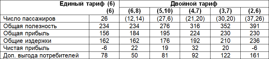Согласно Дюпюи, общая полезность всегда разбивается на три части: упущенная полезность, дополнительная выгода производителя и дополнительная выгода потребителей. При тарифе, равном 6 франкам, общая полезность, составляющая 234 франка делится следующим образом. Потерянная полезность равна 52 франкам, это общие переменные издержки перевозки (предполагается, что фиксированных издержек не существует). Дополнительная выгода производителя идентична чистой прибыли, составляющей 104 франка. Дополнительная выгода потребителей составляет оставшиеся 78 франков. Сумма этих трёх частей равна 234 франкам, эта общая полезность относится к 26 пассажирам (из Табл. 12–1).
