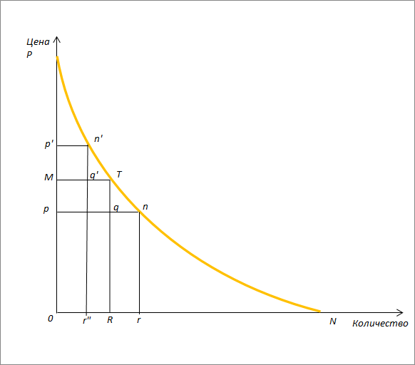 Площадь внутри OPN представляет собой общую полезность, извлечённую из товара, который имеет кривую спроса PN. При цене Ор, потребители выплачивают сумму денег, равную Ornp, и получают дополнительную полезность в объёме nPp