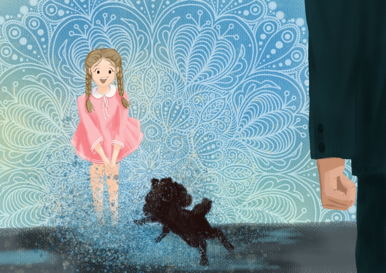 Пахнет землёй после грозы и цветущей сиренью. Набухшие дождём тучи прячут и открывают солнце. Девочка в розовом платье рассматривает отражение в луже на асфальте. На неё, разбрызгивая воду, несётся щенок чёрного пуделя, толкается носом в кружева на платье.