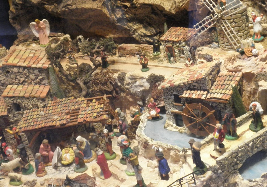 К началу декабря в центре города устанавливают деревянные киоски Рождественского базара и продают на нём сладости, украшения, сахарную вату, печеные каштаны, а также изделия местных ремесленников из которых самыми уникальными являются маленькие глиняные фигурки «сантоны», расписанные вручную . Фигурки изображают персонажей вертепа-сцены рождения Иисуса Христа в окружении Марии, Иосифа, волхвов и животных хлева, в котором произошло событие. Позже мастера стали изготавливать представителей разных профессий, овощи, фрукты, деревья, и копии зданий характерных для французских городов. Фигурки коллекционируют. К Рождеству в домах размещают сценки из этих фигурок, это может быть как вертеп так и сценки из городской жизни. Каждая фигурка стоит от 15 евро, и не все семьи могут себе позволить создать такую многоперсонажную композицию. Но в церквях и витринах магазинов они представлены. И Слава Богу что в праздник Рождества в столь светской Европе, где даже открыток поздравительных с христианской тематикой днём с огнём не найти, традиция сантонов продолжает развиваться (каждый год сценки дополняются фигурками представителей новых «современными» профессии) и радовать глаз.