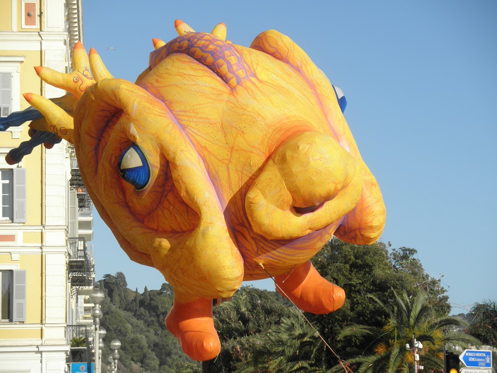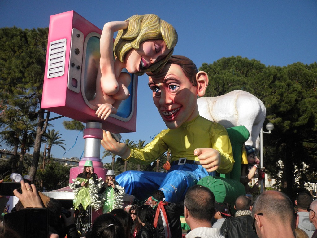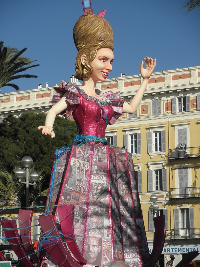 На время Карнавала в самом центре города на Площади Массена устанавливают высоченные платформы состоящие, как на стадионе, из рядов с сидячими местами. Карнавал состоит из дневного парада «Битва цветов» – 17 платформ, украшенных цветами и темой карнавала проезжают мимо трибун. На каждой платформе стоит девушка одетая в огромное цветочное платье разбрасывает букеты зрителям. Букеты веточек мимозы, роз, лилий, букеты гвоздик. После парада по улицам города ходят счастливые зрители с букетами в руках.