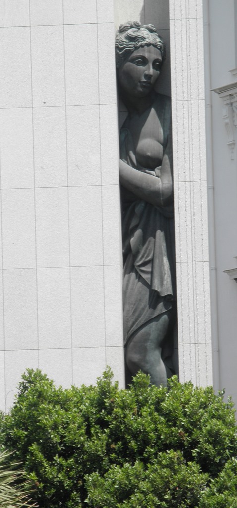 Скульптура в саду библиотеки и вид на старый квартал.