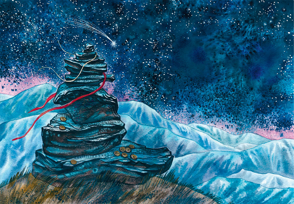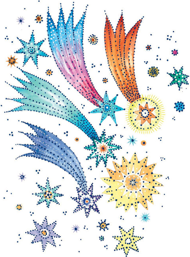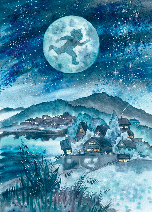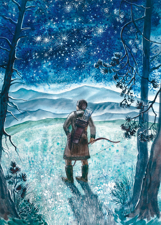 Оттолкнувшись от краешка остроносой горы, охотник подпрыгнул так высоко, что смог зацепиться руками за одну из звёзд и вскарабкаться на небо. Хвостатые кометы тут же разлетелись по всему небосводу, оповещая его обитателей о появлении чужака:
